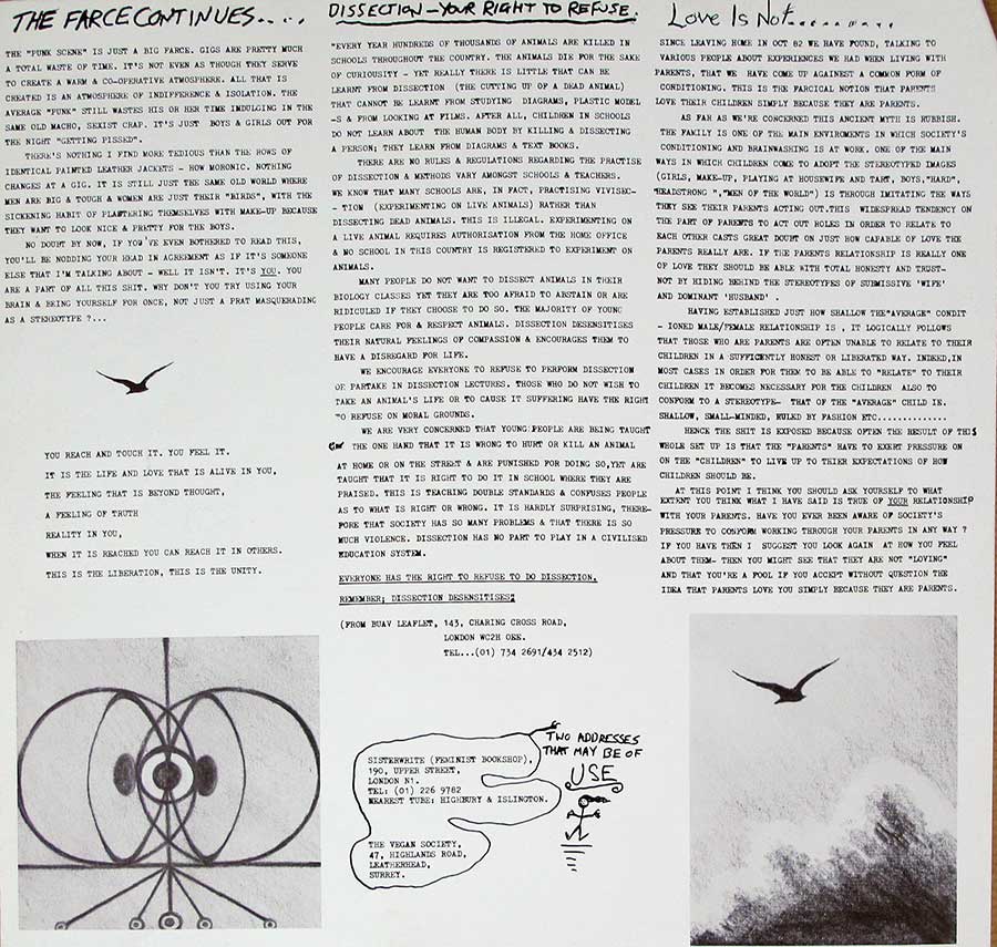 Dass das alles kein neues Phänomen ist, lässt sich nachlesen. Rudimentary Peni haben in Beilageblatt von Death Church bereits festgehalten, dass sich die Verhältnisse zwischen Frauen und Männern in der Szene kaum von denen in der breiten kritisierten Gesellschaft unterscheiden. Große Differenz? Eher Verpackungsfrage. Viel Anspruch und wirklich null und nichts dahinter.